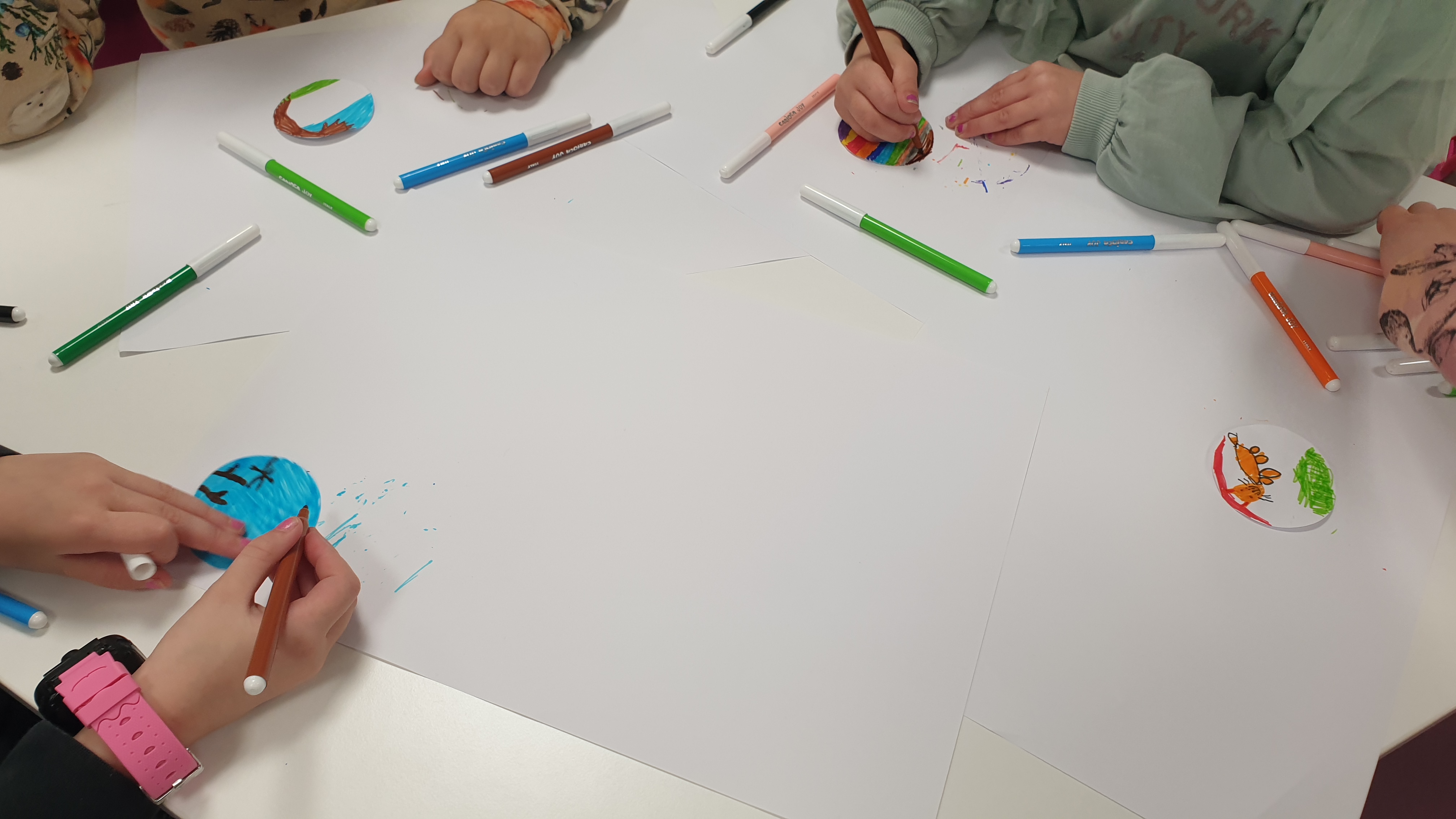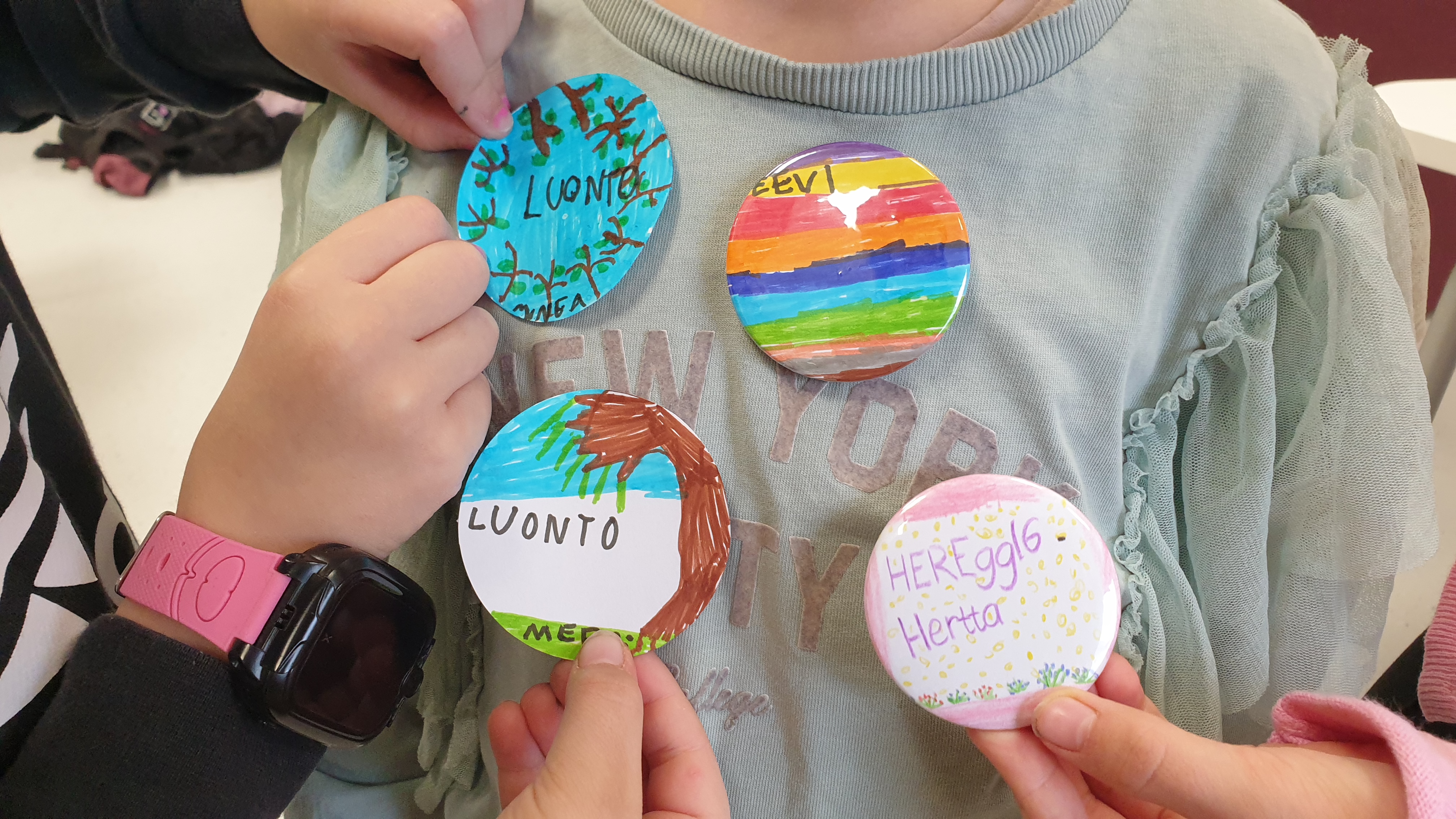 Pinssien teon ja tutustumisleikin jälkeen teimme kerholle yhteiset säännöt, joihin kuului mm. seuraavia juttuja: pitää kuunnella ohjeita, ei saa kiusata eikä nimitellä ketään, laitetaan aina tavarat paikoille askartelun jälkeen, ja kunnioitetaan luontoa.