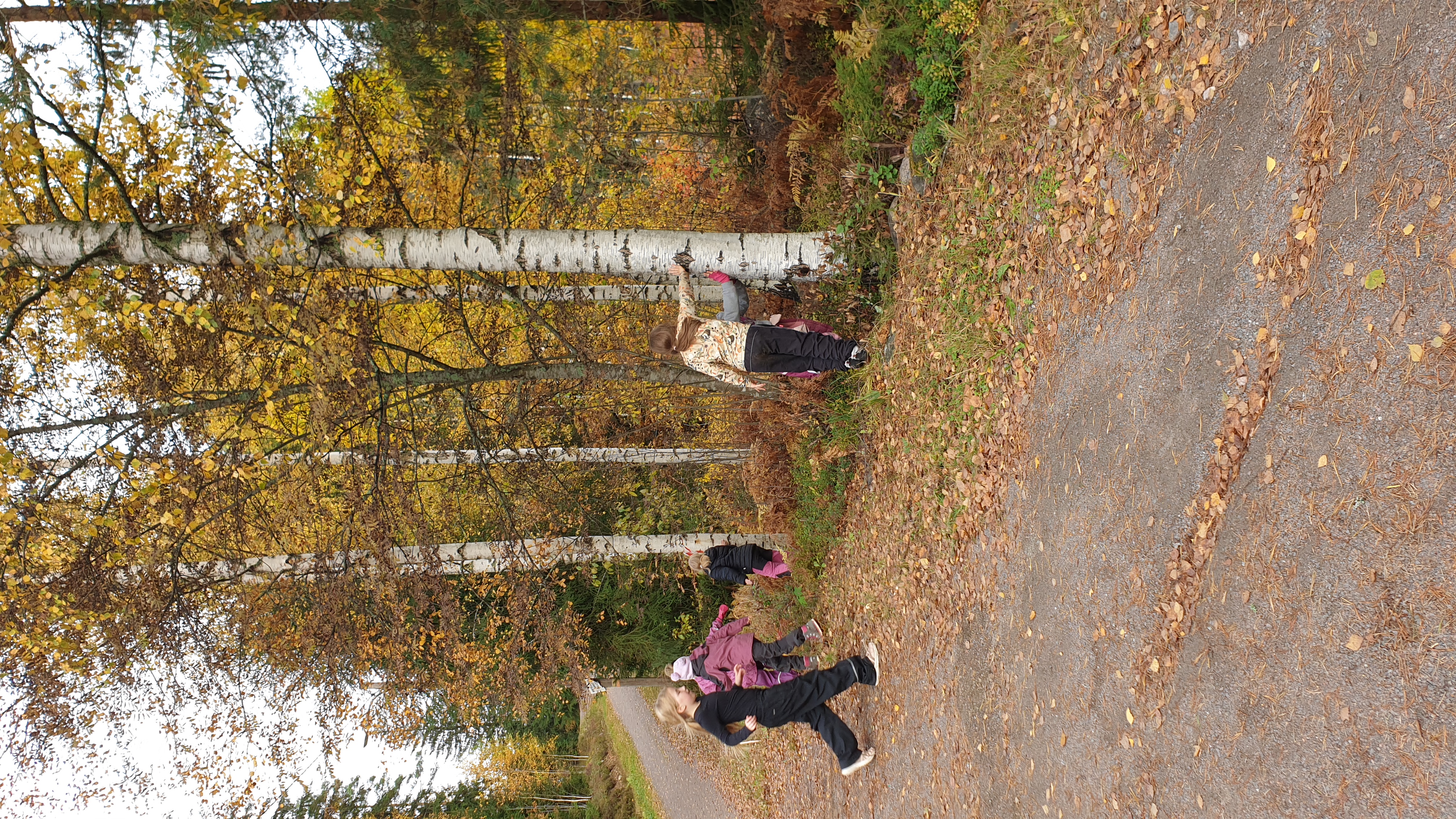 Muistimme kuitenkin käydä ottamassa valokuvan viikottaisesta vakiokohteestamme; kahdesta koivusta. Huomaatko, miten jo viikossa on koivujen väritys muuttunut vihreästä ruskankeltaiseksi? Juttelimmekin tästä hiukan: ruskahan johtuu siitä, että lehtivihreä alkaa sään kylmetessä hajota ja muut väriaineet pääsevät näkyviin. Tänä syksynä onkin luonnossa oikein hienoja värisävyjä!