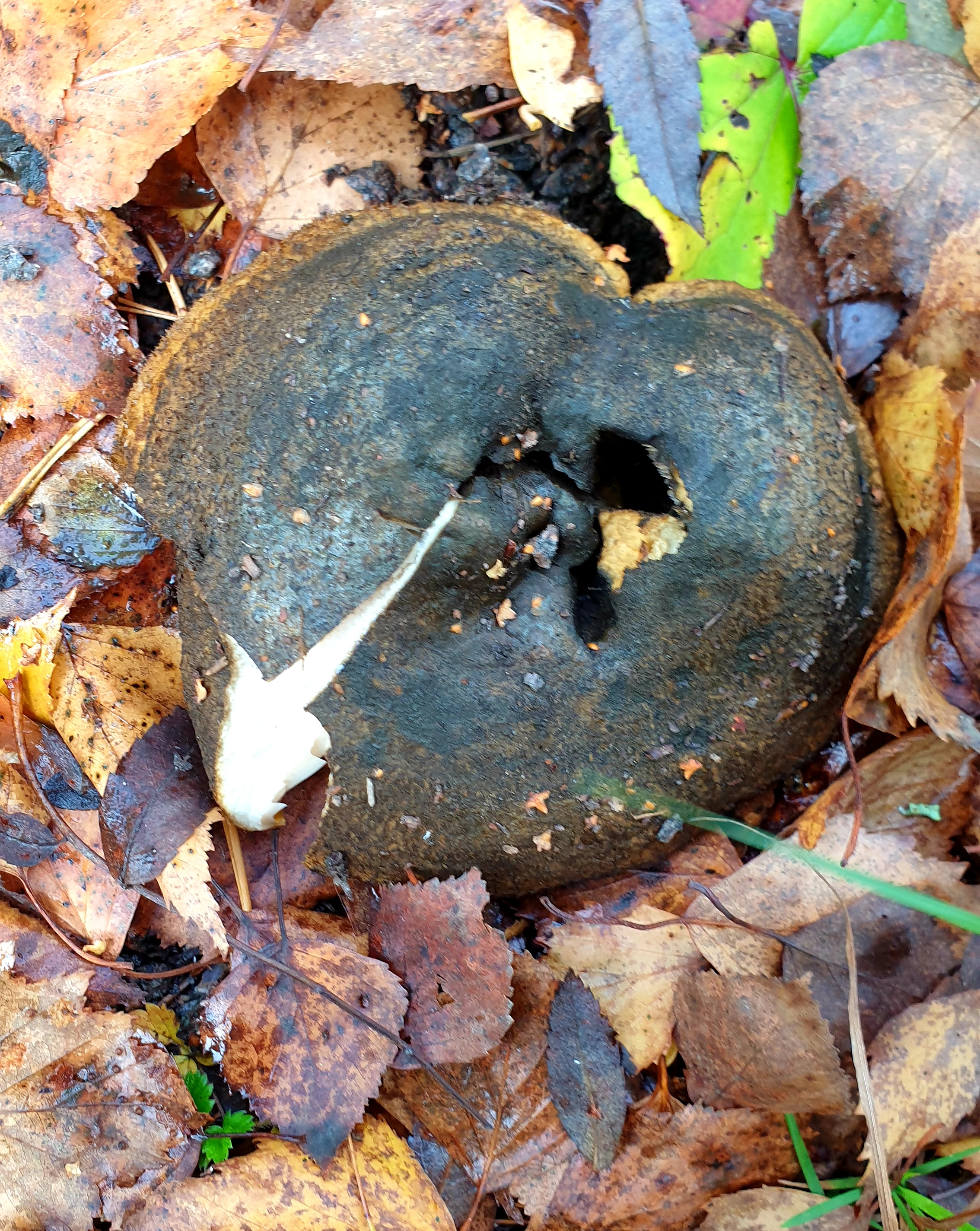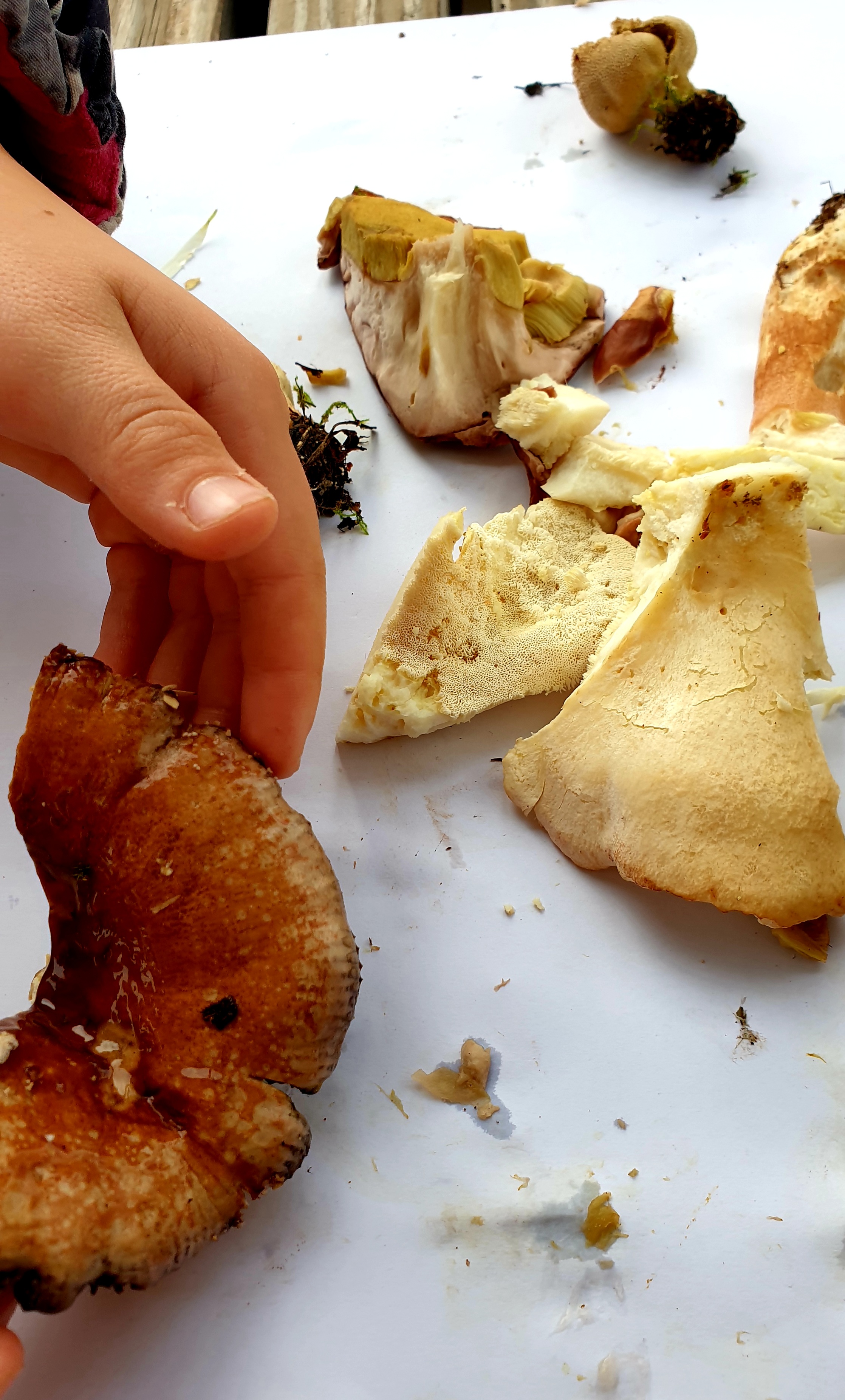 Kerhokerran lopuksi tutkittiin vielä, millaista elämää sienistä löytyy. Me metsätontut olimme keränneet muutamia ruokasieniä, joita porukalla tutkittiin. Nähtiin kyllä tuolla metsänreunassa myös yksi mustarousku, mutta sitä emme ottaneet tutkittavaksi. Ja kyllähän noissa sienissä elämää oli ja on ollut! Toukkien reikiä ja kulkukäytäviä oli vaikka kuinka; etenkin herkkutatti oli kelvannut mukavasti ruuaksi kaikenlasille önniäisille. :)